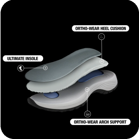 Your feet are a marvel of nature. We created heel-first footwear to match. No flat insoles. No flimsy inserts. This biomechanically superior sneaker includes improved shock-absorbing cushion, upgraded ORTHO-WEAR heel-hugging tech, and arch-supporting ULTIMATE INSOLES for Pain Relief Beyond Belief.
